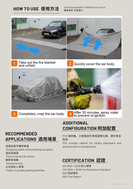 NEW! 電動車滅火氈 (EV Fire Resistance Blanket) 現時停車場多停泊電動車,現場配備滅火氈,可以快速降低電池因持續燃燒產生之熱失控對周遭車輛或人員、環境等造成之損害。 防火毯材質為玻璃纖維+雙面矽膠,可耐熱約550度。 操作: 將防火毯完整覆蓋於著火的車輛最少20分鐘,可有效防止火勢擴散及延燒,阻隔有毒氣體及煙霧蔓延。 尺寸: 6m x 9m 適用多數小型私家車及SUV。 材質:玻璃纖維 + 雙面矽膠塗層 證書:EN 13501-1:2018 另外配置:PVC儲存櫃,把防火氈擺放於車場當眼處