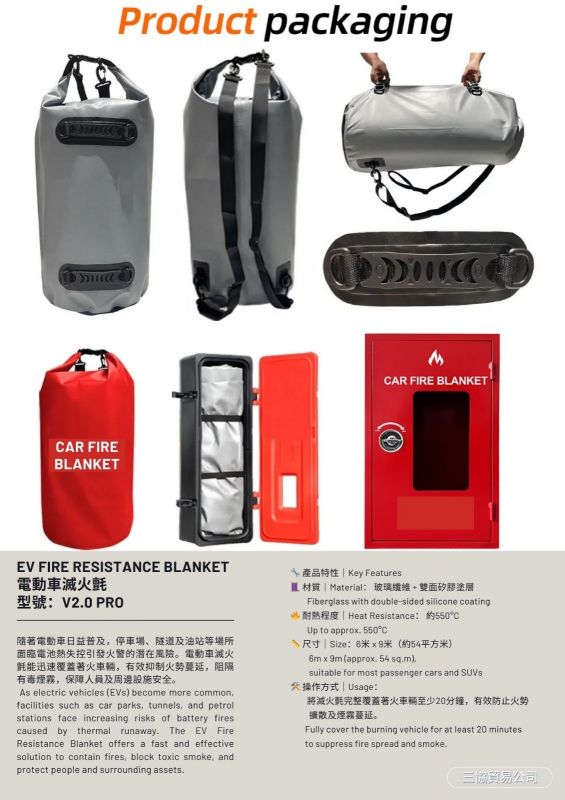 NEW! 電動車滅火氈 (EV Fire Resistance Blanket) 現時停車場多停泊電動車,現場配備滅火氈,可以快速降低電池因持續燃燒產生之熱失控對周遭車輛或人員、環境等造成之損害。 防火毯材質為玻璃纖維+雙面矽膠,可耐熱約550度。 操作: 將防火毯完整覆蓋於著火的車輛最少20分鐘,可有效防止火勢擴散及延燒,阻隔有毒氣體及煙霧蔓延。 尺寸: 6m x 9m 適用多數小型私家車及SUV。 材質:玻璃纖維 + 雙面矽膠塗層 證書:EN 13501-1:2018 另外配置:PVC儲存櫃,把防火氈擺放於車場當眼處