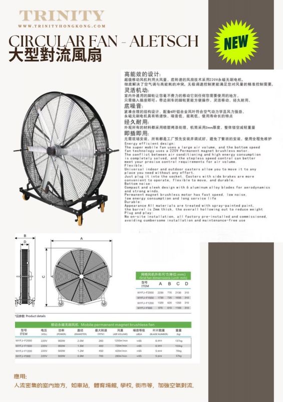 Aletsch 大型室內對流風扇 座地大型的對流風扇,可以增加室內空氣對流,尤其是在人口密集的環境中,提供空氣流通的舒適度。例子車站、體育場館、學校禮堂、室內街市等。 Aletsch 提供四款型號及尺寸可供選,校薄個機身及圓形的設計,更適合不同環境使用。