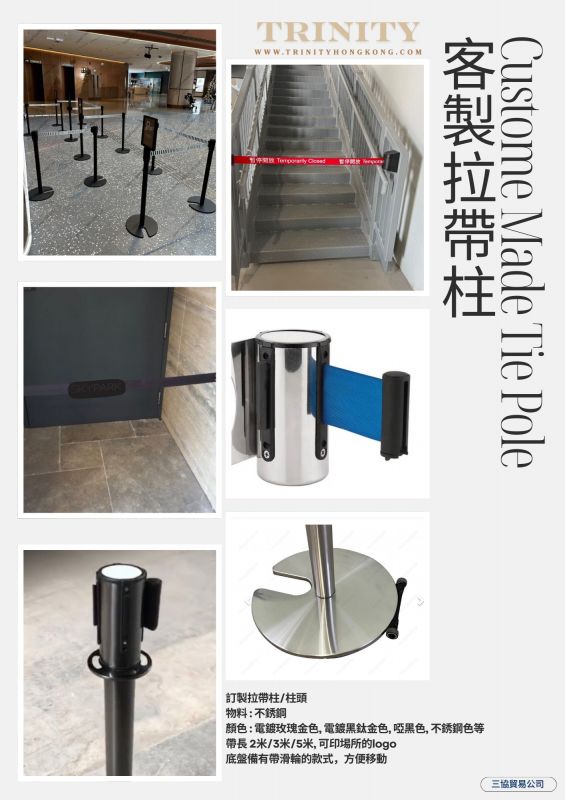 訂製拉帶柱/柱頭 物料 : 不銹鋼 顏色 : 電鍍玫瑰金色, 電鍍黑鈦金色, 啞黑色, 不銹鋼色等 帶長 2米/3米/5米, 可印埸所的logo 底盤備有帶滑輪的款式,方便移動